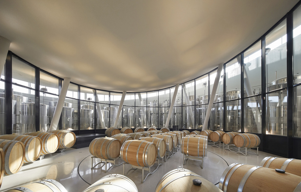 Perched atop Padi Hill, the winery is defined by two intersecting, lens-shaped volumes housing the restaurant and bar. Supported by slender steel columns, these elevated structures create a powerful illusion of levitation. All functional areas requiring stable temperatures, such as the dramatic circular fermentation halls and cellars, are located underground. This design cleverly separates the industrial process from the visitor experience.